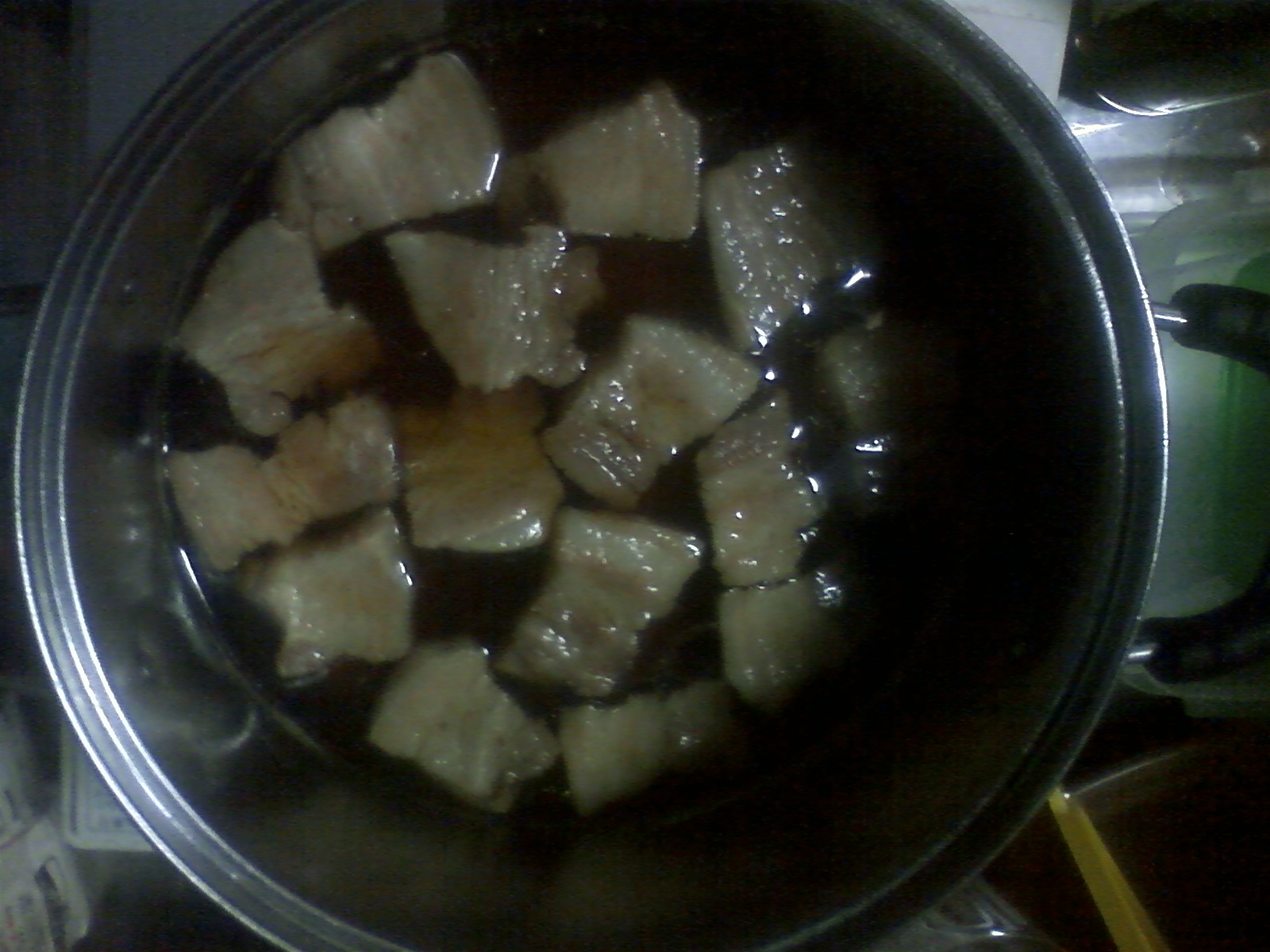 肉を皿に移し、鍋に残った油を捨て、水・酒を入れて中火で加熱。肉をほうりこみます。