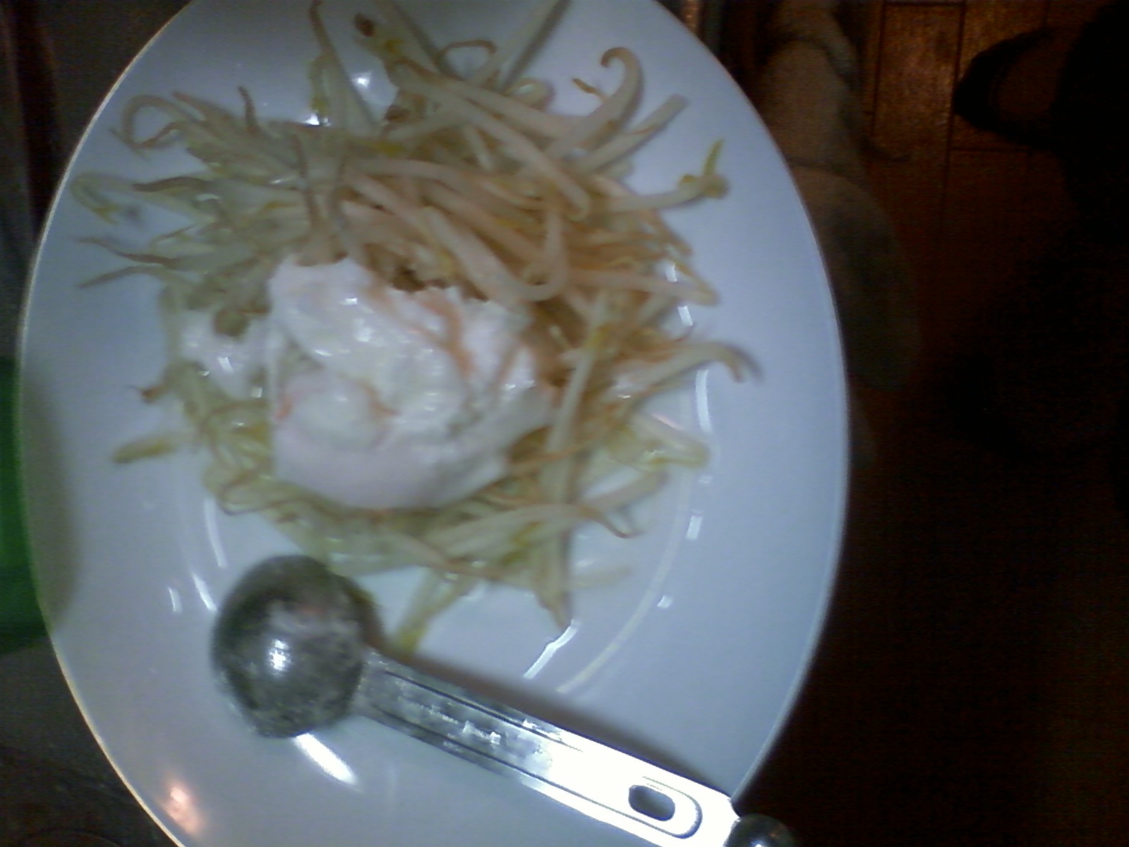 2:フライパンで湯を沸かしもやし、卵を入れる